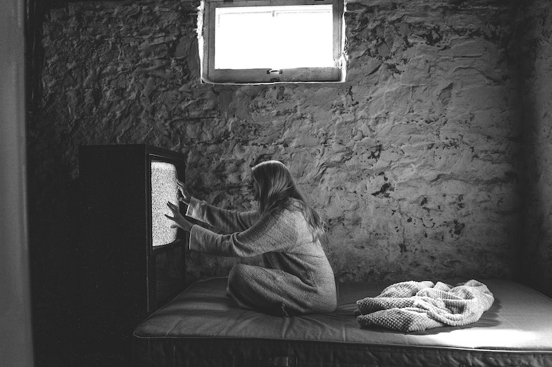 The woman sat in her bed, wearing pajamas and a hospital gown. She was alone in the room, with a television. The screen was filled with static, but the woman didn't seem to notice. She was focused on the screen.